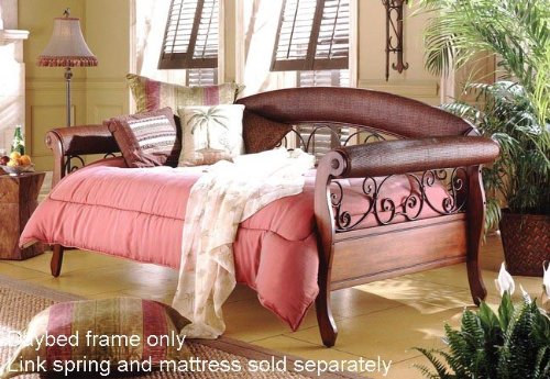 Saigon Autumn Metal Wood Wicker Daybed Constructed from a combination of solid Meranti wood, woven Wicker, and Iron Scroll work, this daybed is truly our most exquisite! The intricate designs created by the iron scrolls are the finishing touch of this classic! The deep Autumn Brown finish gives off a warm, inviting feeling and thoughts of relaxation ahead! This daybed comes with a 10 Year Manufacturer's Warranty. Accessories and mattresses are not included. Item may require simple assembly. Specifications - Dimensions: Twin Size - 46-1/4"H 88"W 40-1/4"D - Materials: Maranti/Wicker - Color: Autum Brown - Pieces: 1